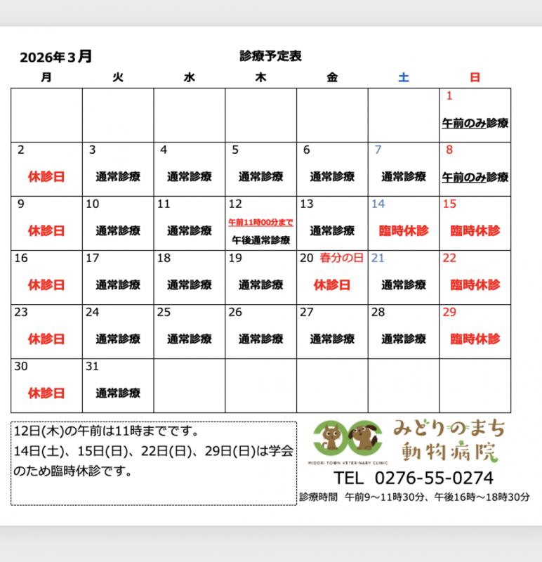3月の診療カレンダーをアップいたします。